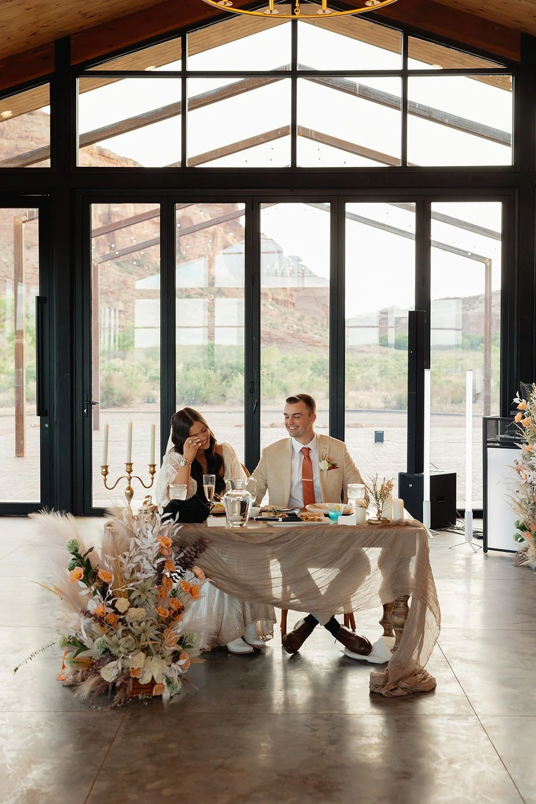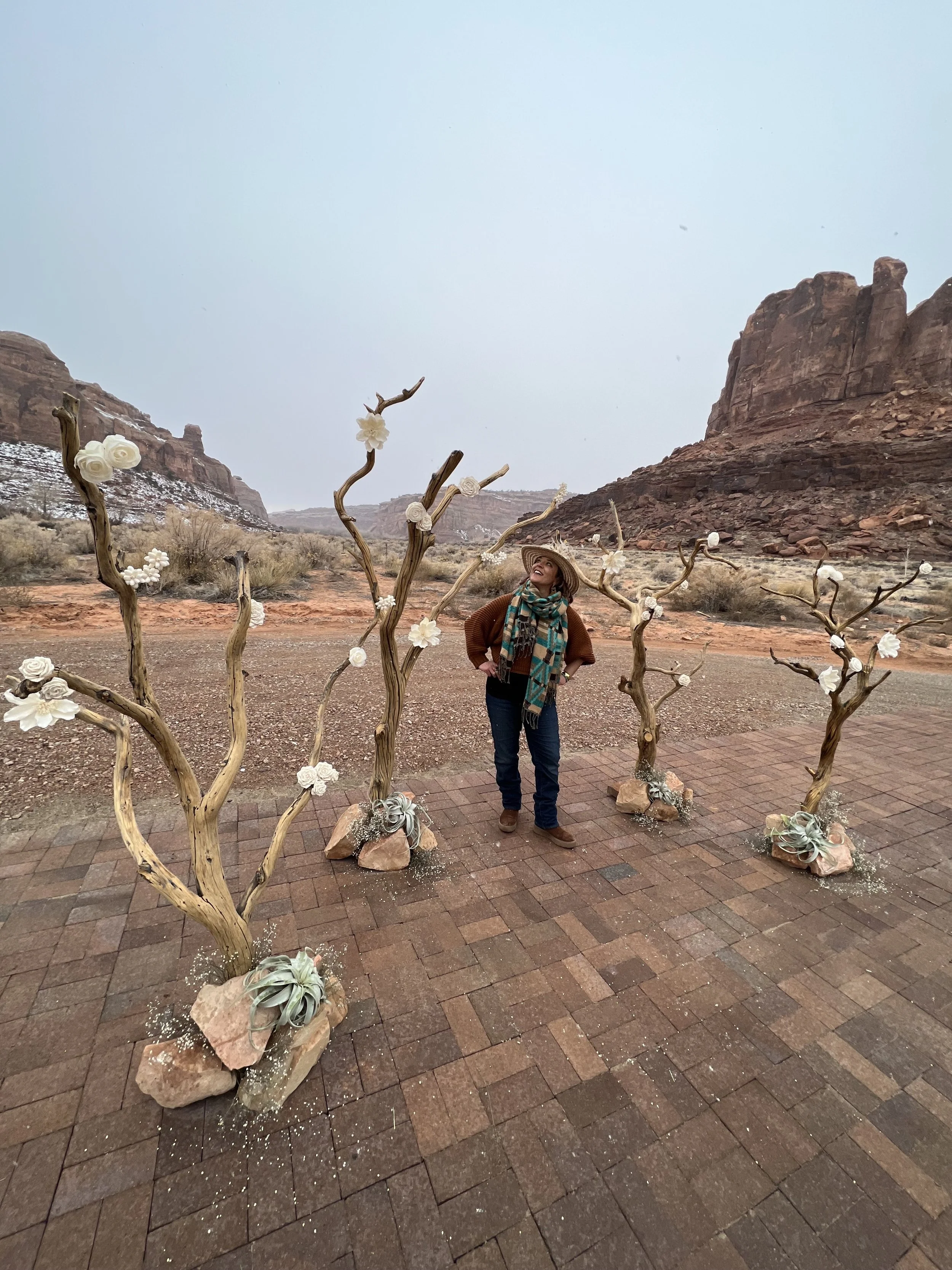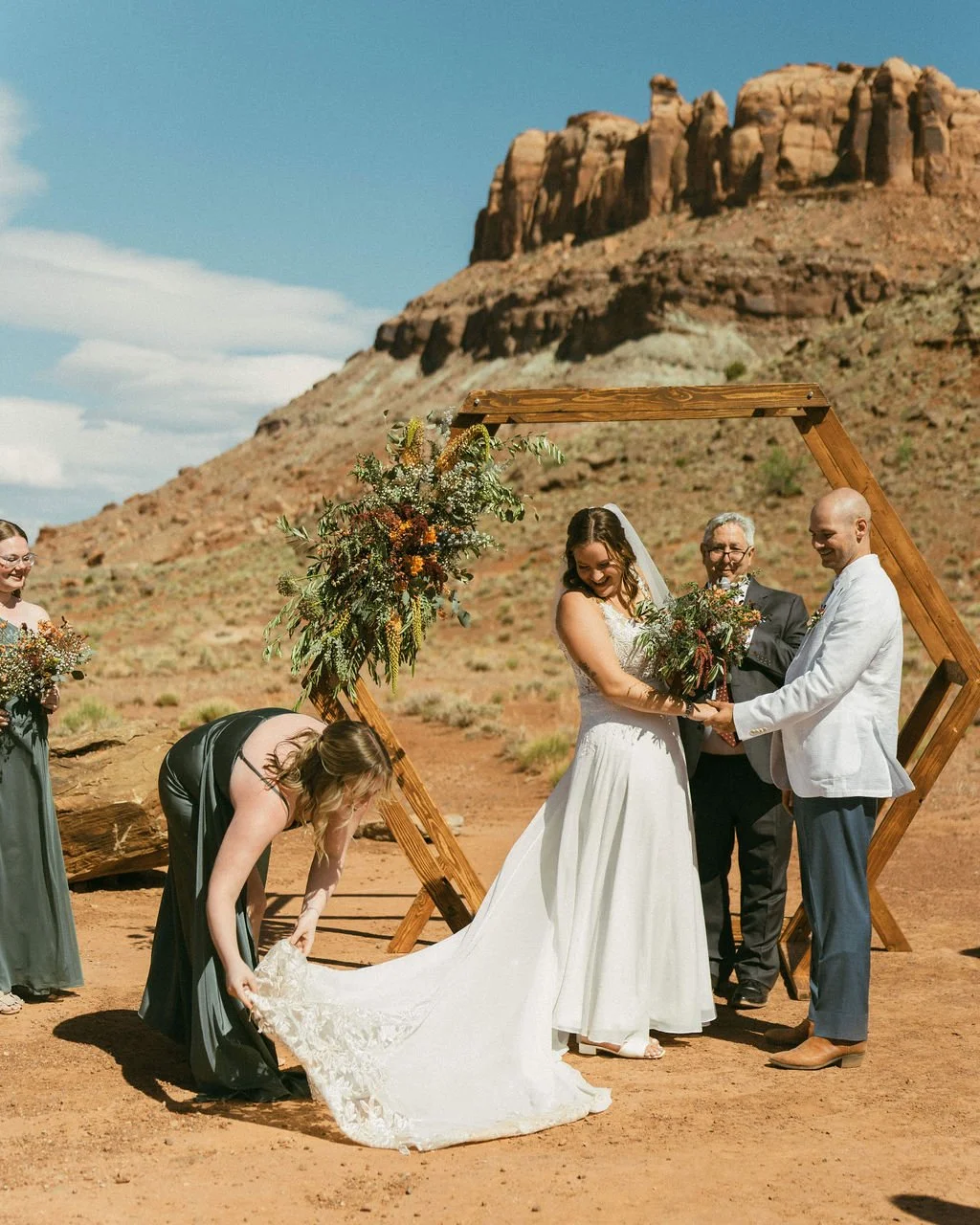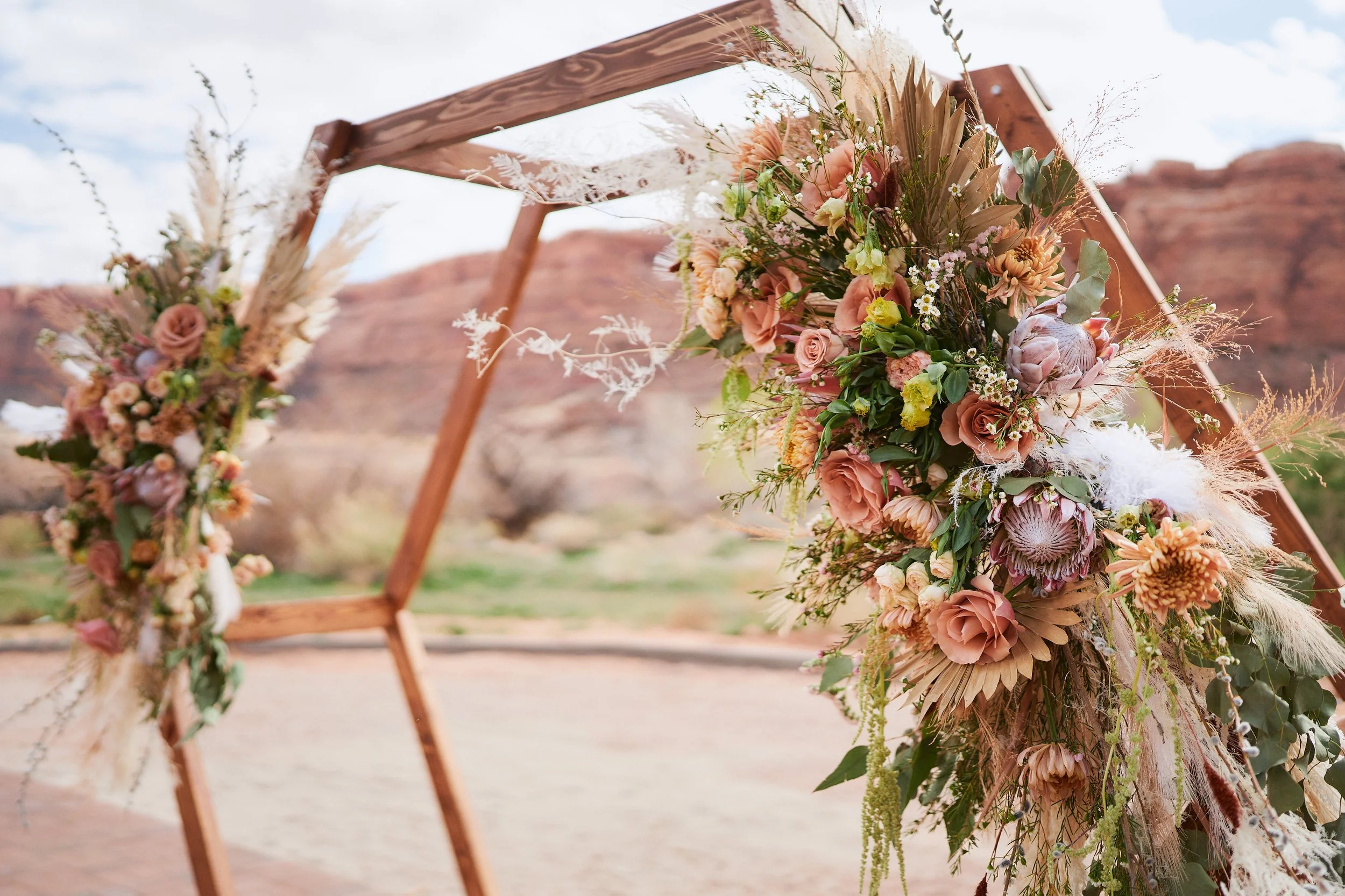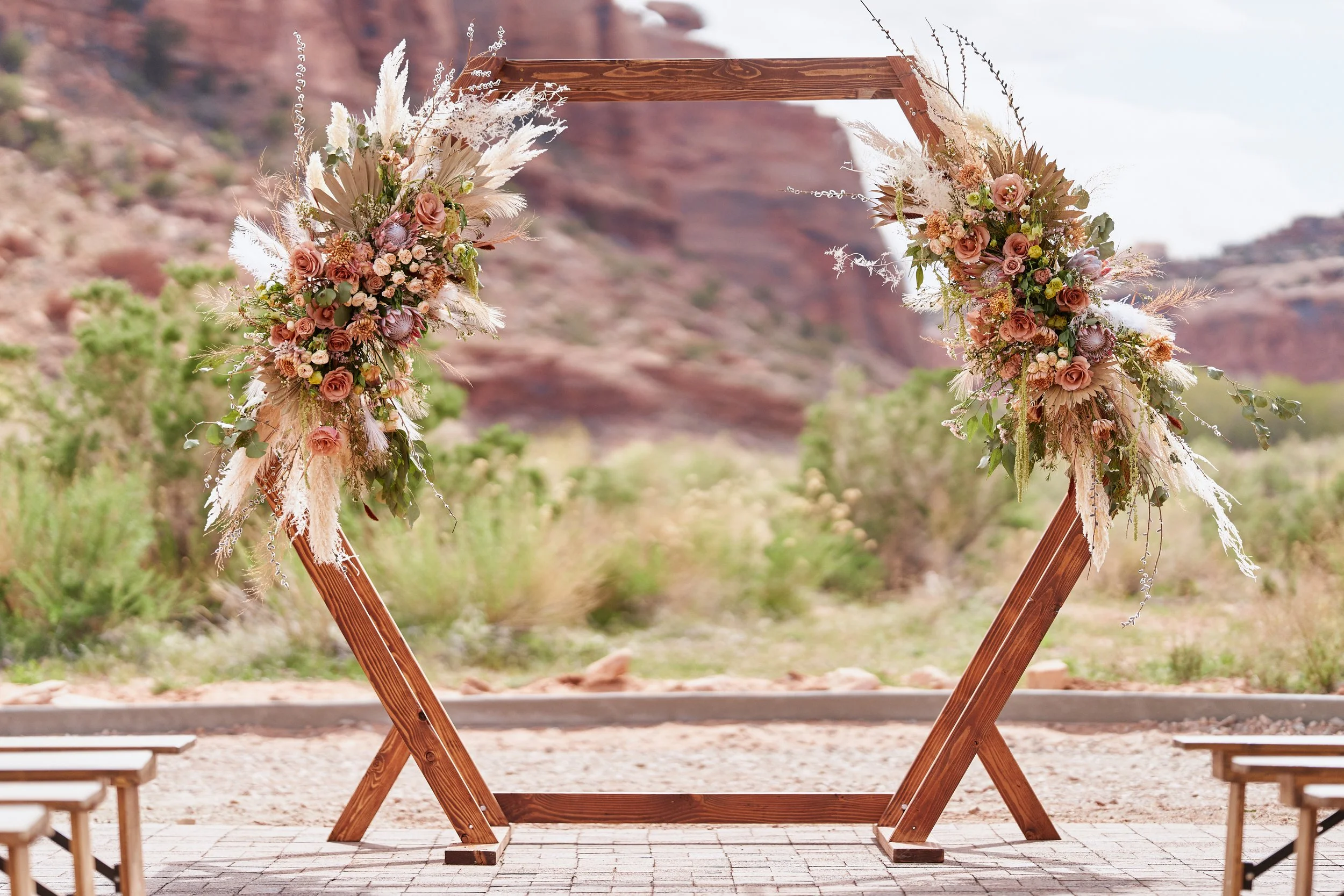 offers a gorgeous framing of your ceremony and can be repurposed to set behind your sweetheart table. We built it to withstand the powerful winds in Moab with plenty of stabilizing anchor points and even weight distribution.