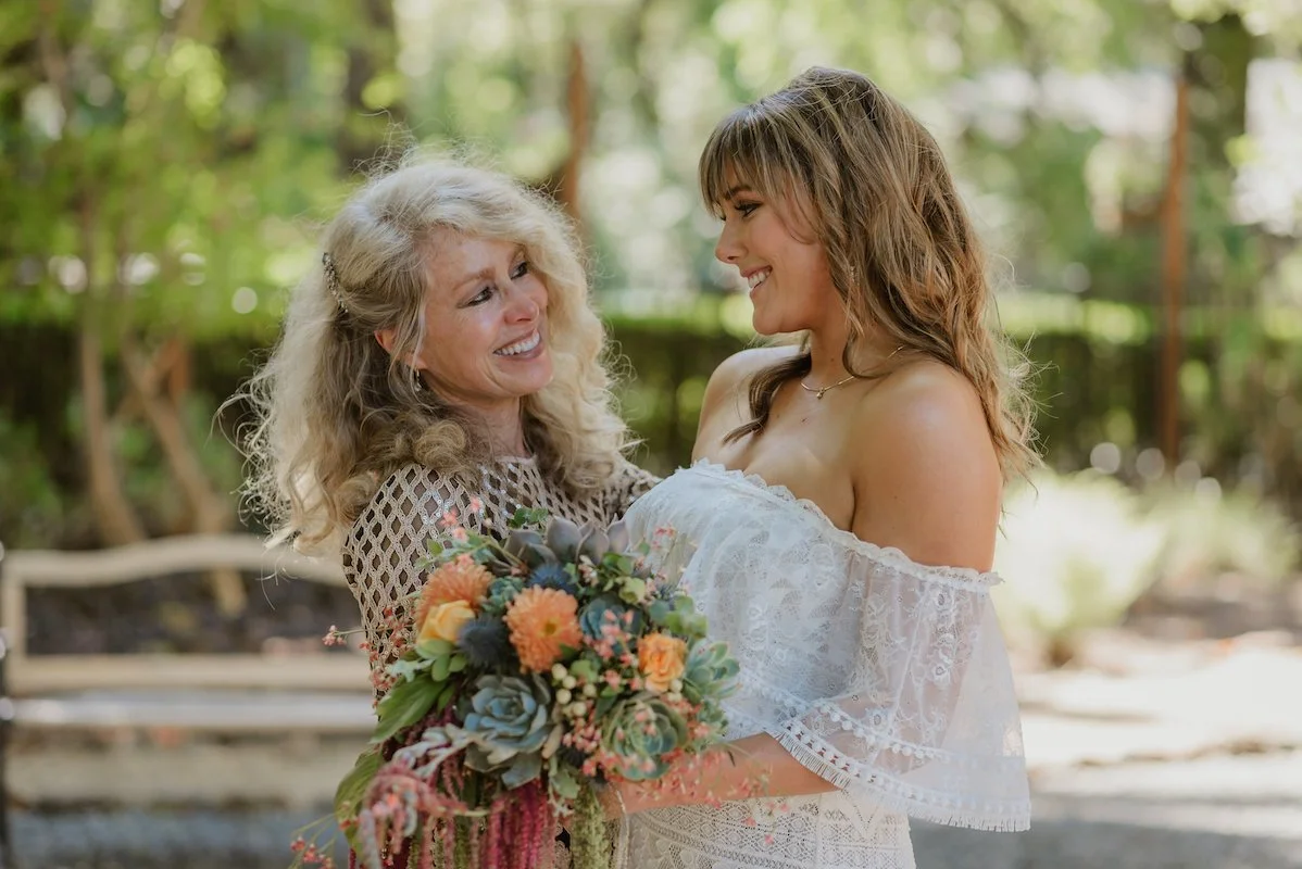 She wore an off-the-shoulder, floor-length boho-style wedding dress by Grace Loves Lace and a Grecian gold pin in her hair for a very simple down-do and natural makeup. The look allowed her true beauty to shine through, framed in gold and a muted summer palette.