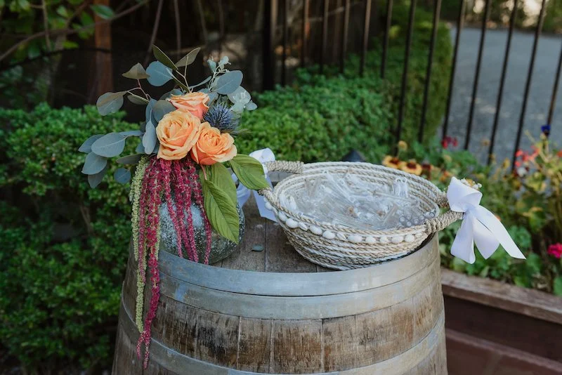 As guests approached the wedding location, they were escorted in through a wrought iron gate flanked by two wine barrels, which were adorned with decorative glass vessels displaying draping amaranth, coral and orange roses, and greenery. Guests grabbed their programs and little vials of bubbles for the post-ceremony send-off.